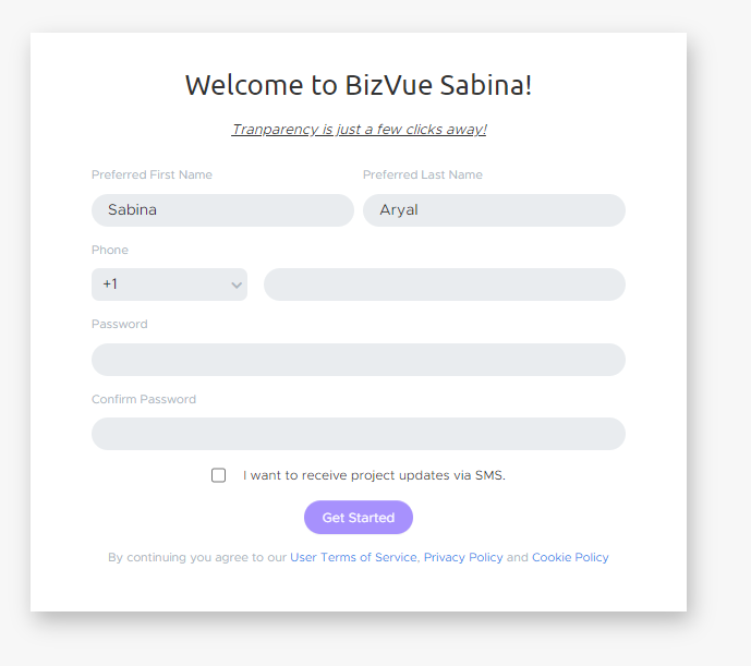 When the onboarding page loads, you’ll need to enter your name, phone number, and the password you’d like to use. Select whether you want to receive project updates via SMS and hit Join.